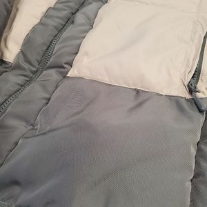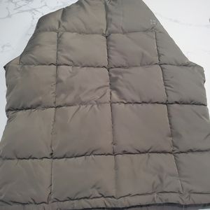 Great shape puffy jacket. kind of a olive green and tan. Small stain that may wash out on front shown in picture not very noticeable.