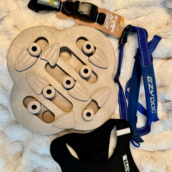 Large Dog Bundle: EzyDog brand, quick fit, dog harness, lightweight, adjustable, blue, Size L. Outward Hound hide n slide enrichment toy, for treats or mealtime fun, cleans easily, level 2. Also included a Dr. Oakley mesh dog collar, size M-L breeds 15”-23”. Lastly, TrueCanine mesh harness black. Let the fun begin.🐾