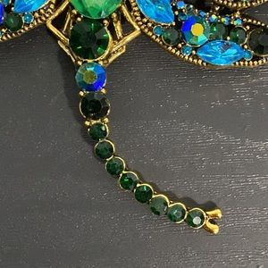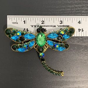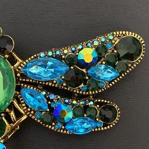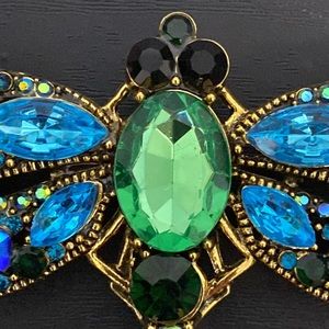 Stunning dragonfly brooch with rhinestones in different shades of blues and greens. Gold tone back.