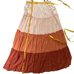 This flowy bohemian dress features a square neck,a tie strap detail for the perfect adjustable length, elastic stretch chest, and tiered ruffle layers to complete the look. Beautiful cream, creamy peach, and Terra cotta (orange tan) colors. Easy breezy style. It's perfect for a fall festival with a jean jacket and booties, a cruise, beach, vacation party, or a lazy Sunday afternoon.