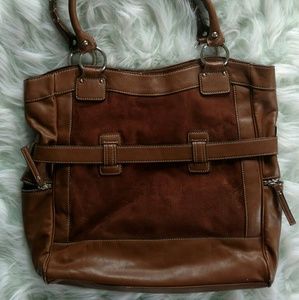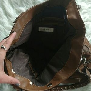 Large and in charge shoulder bag from Nine West! Perfect for leaving the house with everything you need! Nice bucket bag with unique finishes. There is slight damage on the top inside of the bag. Unnoticeable when using! Easily disguised, as well.