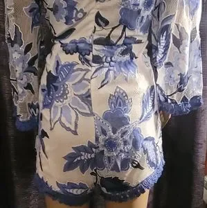 Large Blue and White Sleeved Net Embroidered Romper with lining.