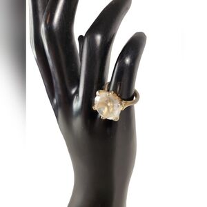 This ring is oversized, gaudy, and a lot of fun! It's set in gold tone metal and the clear, faux diamond stone is faceted to shimmer! It's important to note that the gold tone has faded around the band and the stone shows some fogginess - it's not perfect, but it's still fun!