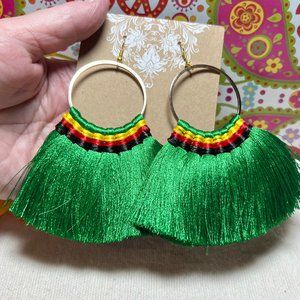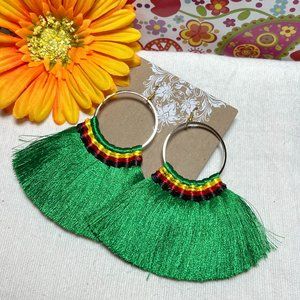 Large Fan Tassel Earrings Green Hoops Long Smooth Silky Fringe Drop Dangles NWT