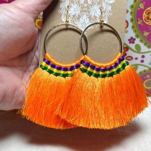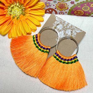 Large Fan Tassel Earrings Orange Hoops Long Smooth Silky Fringe Drop Dangles NWT