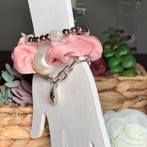 Delightful Large Faux Pearl and Heart Pink and Silver color Bracelet Set. Set of 3 bracelets, 2 stretch and 1 adjustable chain.