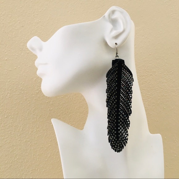 Salvaged black faux suede feathers decorated fully with rhinestones fashioned into large statement earrings. Glam, glam, glam!