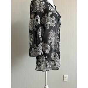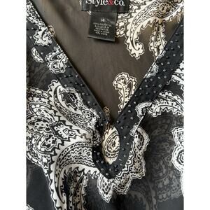 The Style & Co. Black Beaded Floral Blouse is a boho, artsy, and fairy-like coverup perfect for size 14 women. Made of sheer polyester material, this blouse features long sleeves, a round neckline, and embroidered accents for added flair. Its black color and floral pattern make it a versatile piece that can be styled for various occasions. With its basic style and regular fit, this blouse from Style & Co. is a must-have for women looking to add a touch of whimsy to their wardrobe.