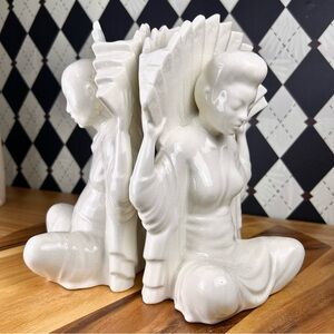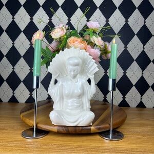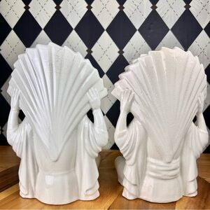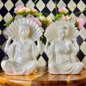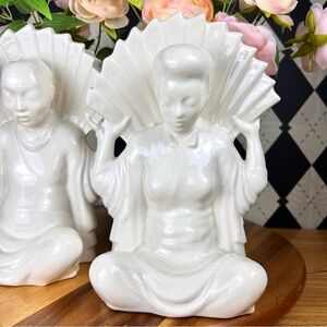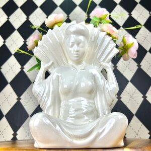 This serene and Zen vintage Japanese porcelain sculpture is both a a vase and a sculptured figurine decor. The fan-shaped form behind the figure opening accommodates stems or floral arrangements.