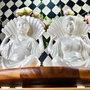 vintage Japanese porcelain vase, Japanese ceramic figure, seated porcelain sculpture, white crackle glaze décor, luxury ceramic accent, designer global décor, rustic luxe home piece, colonial influence décor, Japanese cottagecore vase, artisan porcelain vessel, sculptural white ceramic, fan-shaped vase, 10 inch Japanese figure, collectible vintage porcelain