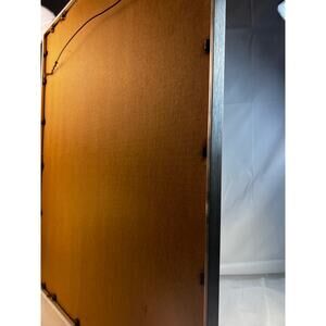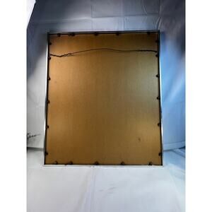 Measuring 24.5" x 28.5" and beautifully framed, it reflects the mid-century modern aesthetic with shimmering metallic detail and intricate craftsmanship.