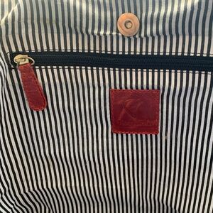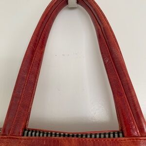 Beautiful handmade Vanguardia en Piel (Mexico) genuine leather tote in a rich burnt orange / rustic red. This oversized artisan bag features natural leather texture, rolled handles, a striped fabric lining, and multiple interior pockets.