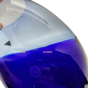 Large glass vase cobalt blue angle design heavy thick. Gorgeous color, upclose photo shows 1 small bubble in the glass, there are some tiny scratches but no cracks and it is very difficult to see the imperfections. The blue part of the glass is thicker on the inside, and you are able to feel the transition inside of the vase from the blue into the clear. This is a beautiful piece of art glass. Smooth pontil, but there are a few scratches on the bottom that are visible. Unable to combine shipping due to weight and fragility. Please see all pictures for details and measurements.
