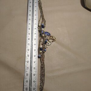 Large Gold Tone Nautical Paperclip Blue White Necklace Anchors Pearls Blue Beads