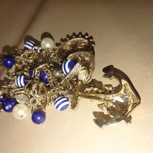 Elevate your style with the Gold Tone Nautical Themed Blue White Charm Necklace, featuring anchors, pearls, and blue beads. This elegant accessory perfectly complements any outfit with its chic and timeless design.
