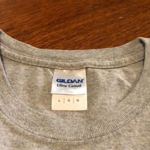 The actual shirt is the Gildan Brand. The screen-print was added as a sample. Marked Large. Washed but never worn. There is a manufacturing flaw under the left sleeve at the armpit. See the last photo for the extra stitching.