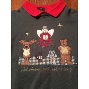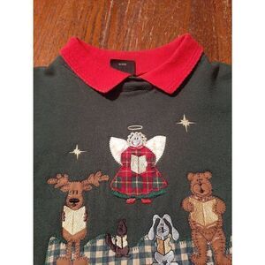 Good Used Condition Women's Size Large TSI Green Long Sleeve Collared with Red, Brown, Gold, White, and Yellow "Let Heaven and Nature Sing" Christmas Holiday Pullover Fleece Sweatshirt