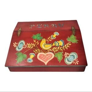 Beautifully hand painted bird, flowers in a tree wooden box in the shape of a desk. The top flips back on brass hinges. The inside & bottom are lined in felt.