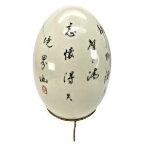This exquisite hand-painted porcelain egg features intricate designs and Chinese woseman and calligraphy, showcasing artistic craftsmanship. The decorative piece is supported by an elegant metal stand, making it a sophisticated addition to any home or office décor. The serene imagery adds a touch of tranquility to its surroundings.