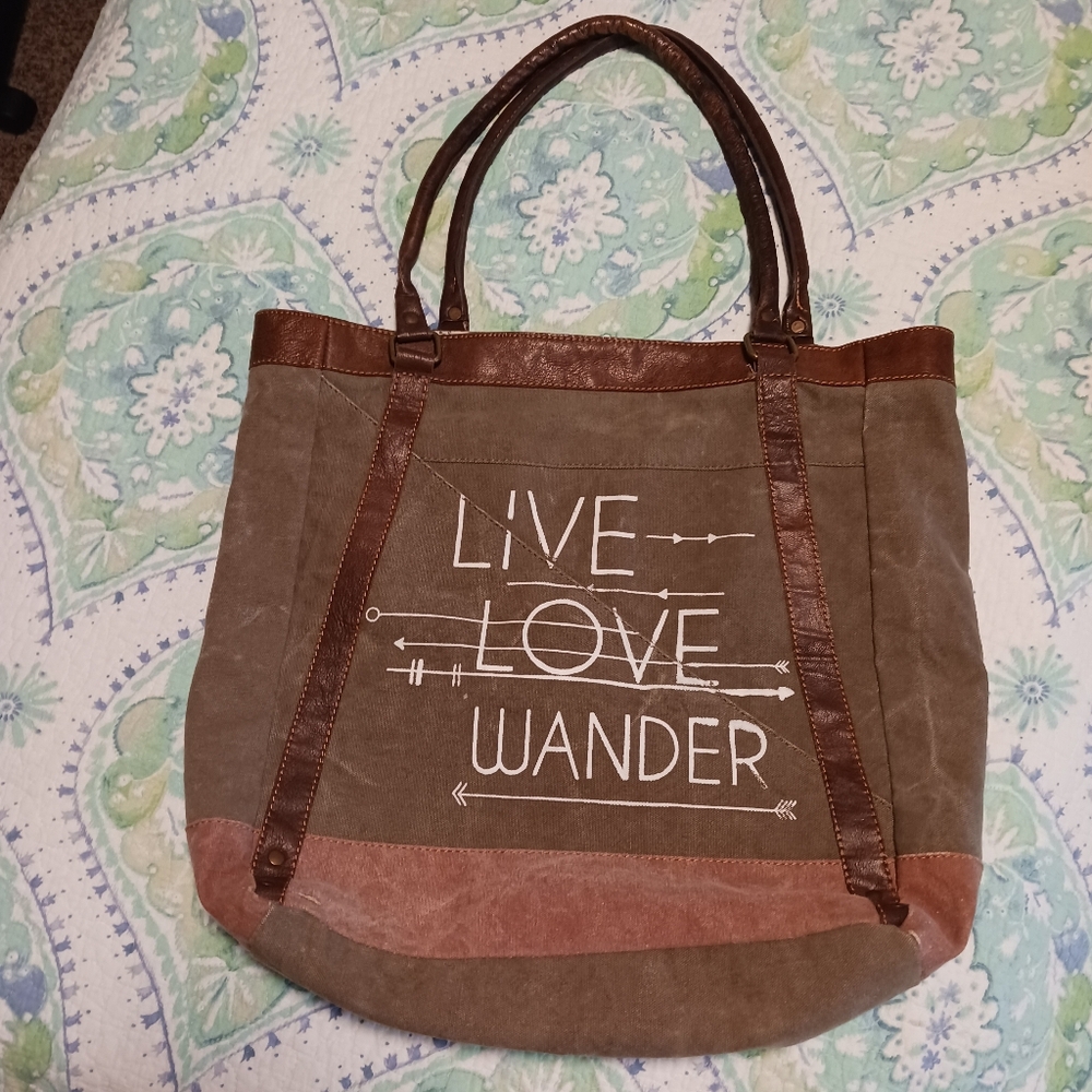 Made from a military rucksack, this large bag has two open pockets and one zippered pocket on the inside. It features brown leather handles and accents. Has one hole in each open pocket that can be easily stitched. The last pic shows a faint stain streak. Priced low because of holes. Color is army green.