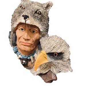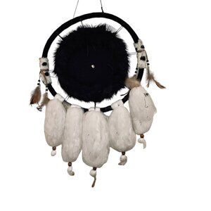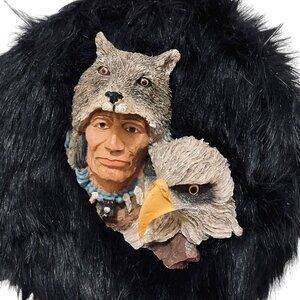 This handcrafted dreamcatcher features intricate details, including a wolf and eagle sculpture, surrounded by black faux fur, feathers, and beadwork. Its bold design adds cultural significance and artistic value to any space.