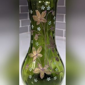 Lovely antique vase in excellent condition with no chips or cracks or wear to the paint. Swirled green glass vase with a base diameter of 4.5" x 9.5" T