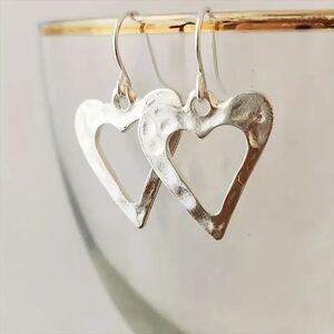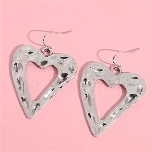 Large Heart Dangle Earrings Hammered Silvertone Drop Open Design Fashion Jewelry