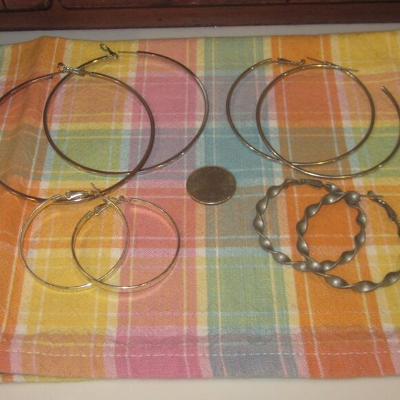 EUC, 4 pairs as shown (top right is missing a clip but will include backs for wearing), bottom 2 pr are 2" hoops, swirls are a pewter type finish, top left is near 4" and top right is 3"
