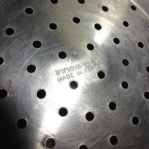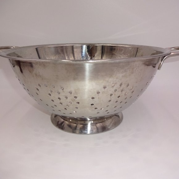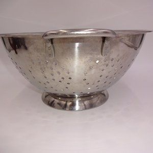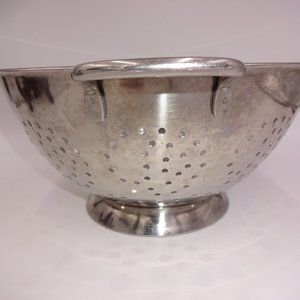 Good pre-owned condition. Footed stainless steel strainer with handles. Made in Korea. Approximate measurements: 11-1/4" x 14-1/4" (including handles) x 5-1/2". Discoloration, water stains, small stains on the bottom, and utensil marks consistent with use.