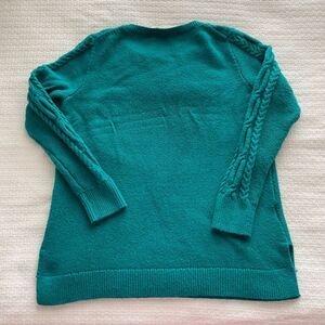 Large LOFT blue-green cotton blend crewneck cableknit sweater. Beautiful bright blue-green color. 55% cotton, 20% nylon, 20% viscose, 5% wool. This is in excellent used condition with no stains, rips, tears, or pilling. Measurements in photos.