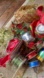 A vibrant collection of festive ribbons and decorations. Includes red, green, and silver accents. Perfect for holiday crafting.