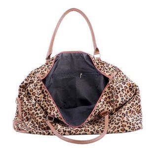 The size of this leopard print weekend bag is 24.4 inches long x 15.7 inches high x 8.25 inches, 2 side pockets and 1 zipper pocket, enough space to accommodate all your travel necessities, 3-5 days replacement Clothes, wallets, mobile phones, umbrellas, cosmetics, toiletry kits, etc.
