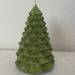 Large lime green sparkly Christmas tree candle. The sparkly on this candle is not just glitter -- it is little tiny balls of iridescent plastic. Really gorgeous. In excellent condition and never used. In original plastic. About 8 inches tall.