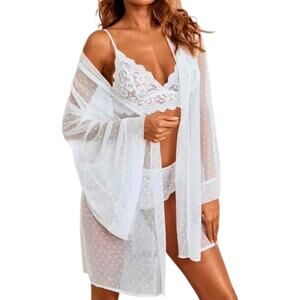 Indulge in the luxurious feel of this beautiful white lace lingerie set. This 3-piece set includes a robe, bralette, and panties, perfect for adding a touch of elegance to your intimate collection. The robe features wide bell sleeves, enhancing its graceful design.