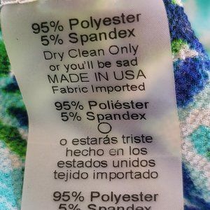 Very good condition, gorgeous Monroe Kimono - great for layering. This piece is textured with a watercolor print in greens, blues and white with a black fringe on the bottom hem. This size should fit sizes 14 to 24. There are 2 pieces of fringe that have pulled but they can be cut.