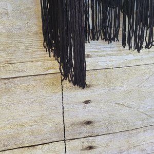 Very good used condition, gorgeous Monroe Kimono - great for layering or as a bathing suit cover-up. This piece features a unique, chevron print textured fabric with black fringe along the bottom hem. This size should fit sizes 14 to 24. There is one fringe that is lose but it can be cut.