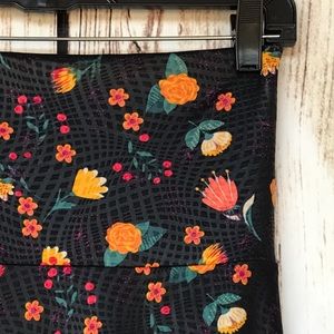 Black background. Size large but has a ton of stretch. Cut little yellow and peach flowers all over. Slinky material.