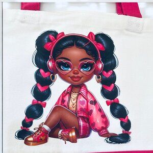 This magenta and white canvas tote features a bold hand-pressed graphic of a confident girl with braids, heart-shaped glasses, and headphones—perfect for everyday flair.