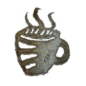 I bought this at an art show many years ago. It’s metal. Measures about 11” x 8”. Excellent condition. From a smoke free home.