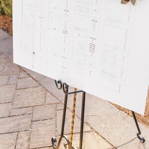 One Milano Modern Metal Easel. Used for wedding signage. Black with gold accents and the scroll holders rotate, if needed.
