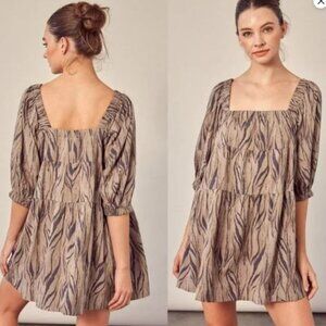 This dress with puff sleeves features a brown and black tiger striped pattern throughout. Made by Mustard Seed, it is wide, loose, and flowy with a square neck from Anthropologie. Perfect for summer vacations and beach getaways and fall gatherings