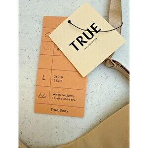 The product is a large True & Co True Body Triangle Convertible Strap Bra in beige color, designed for women in cup sizes C/D or A/B. It features a bralette style with a wireless underwire type and convertible straps, making it a versatile and comfortable option for everyday wear. The brand True & Co is known for its sustainable and inclusive approach to intimates, catering to a range of sizes and styles to suit individual preferences.