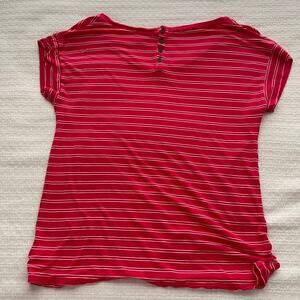 Large Old Navy pink and white striped short-sleeve t-shirt. Buttons at back neckline. 100% rayon. This is in excellent used condition with no stains, rips, tears, or pilling. Measurements in photos.
