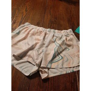 Good Used Condition Women's Size Large Old Navy Stretchtech Dry Quick Ivory, Green, and Peach Dolphin Hem Built in Under Shorts Athletic Casual Sports Workout Gym Running Shorts- Elastic Waist Inner Drawstring