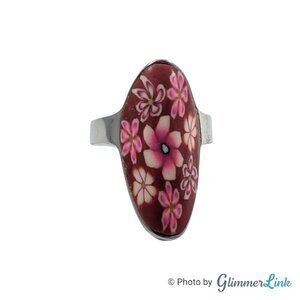 Large Oval Floral Polymer Clay Silver Tone Statement Ring Sz. 10