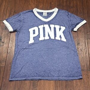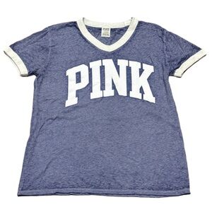 This casual tee from PINK Victoria's Secret features a heathered blue body with white contrast trim on the neckline and sleeves. The bold white 'PINK' logo across the chest adds a sporty touch, making it perfect for a relaxed, everyday look.