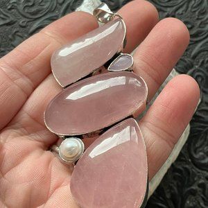 Large Pearl Chalcedony and Rose Quartz Crystal Stone Jewelry Pendant