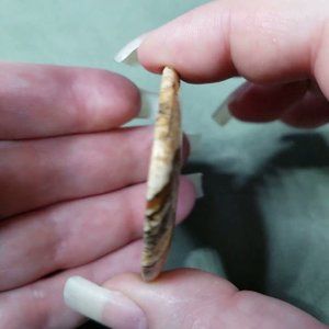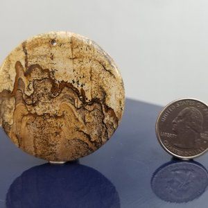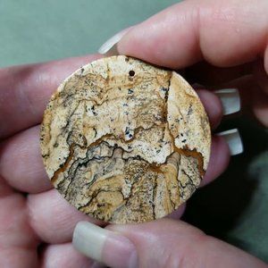 Here we have a large, round Picture Jasper pendant stone, drilled front to back at the top center. It has a flat back and low dome front (both polished) and measures 48.23 x 5.73mm. It has a wonderful pattern reminiscent of an old world map.