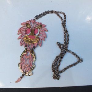 Very large pink and gold lion pendant with moving eyes and swirling tail. The chain is alloy and is 24" inches long. These were very popular in the 1970s, This is a large pendant - Lion is 2 1/2" wide by 5" tall. Pendant and chain are in good condition. Pendant is Signed "Alan" on rear.