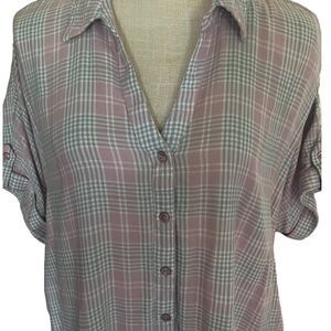 Large Pink & Gray Checkerboard Button Down V Neck Cuff Sleeve Top